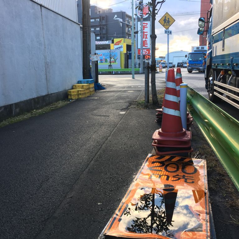 と工事中看板にたまった雨水に映る青空