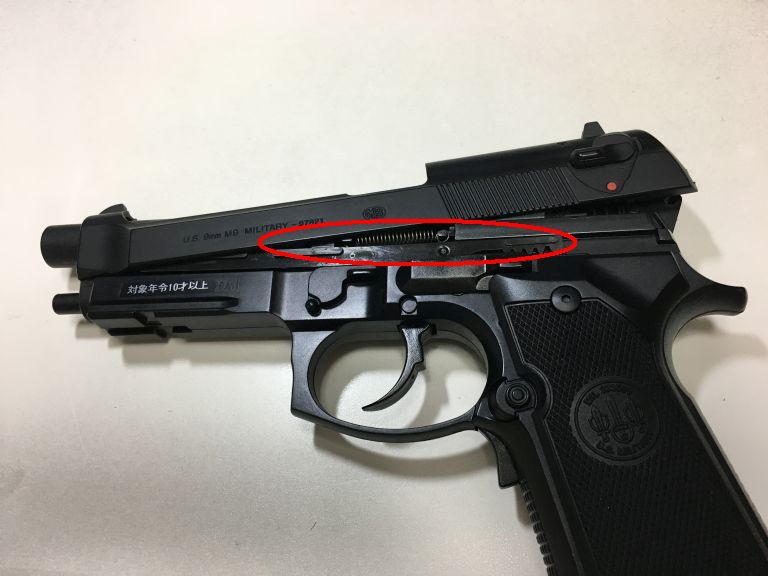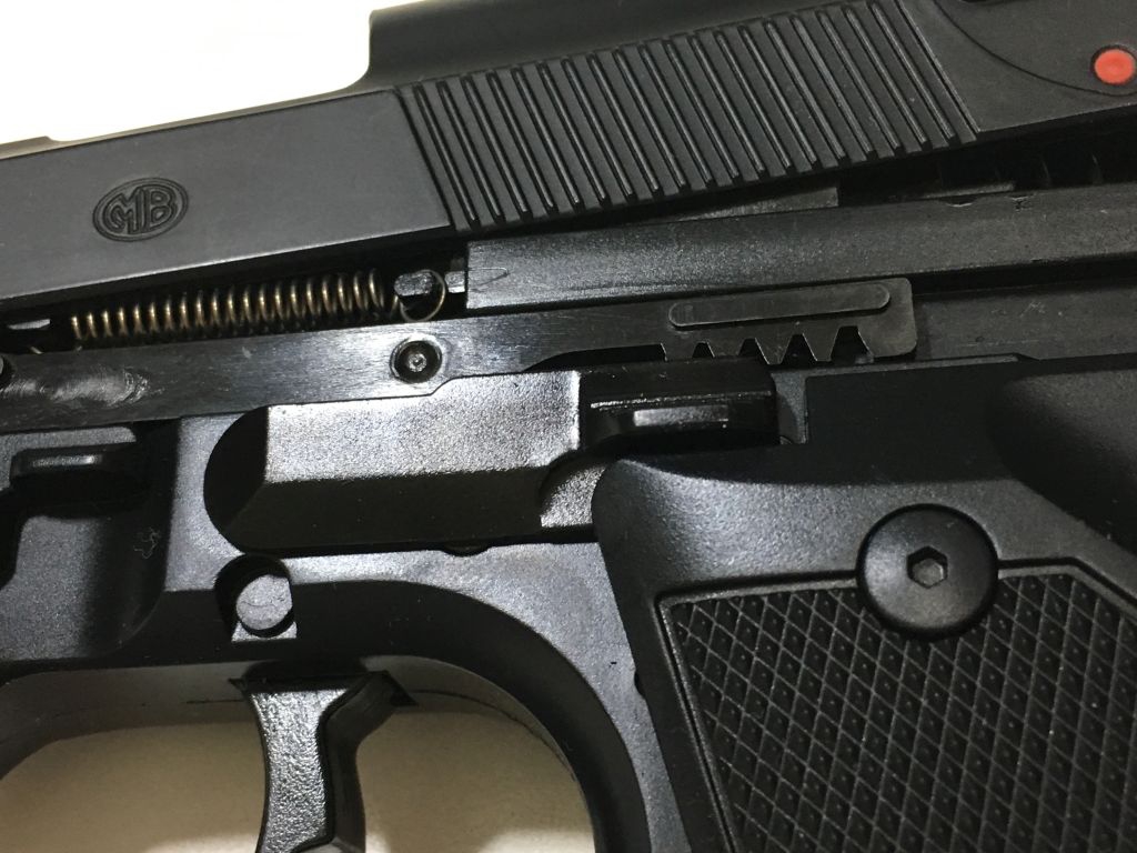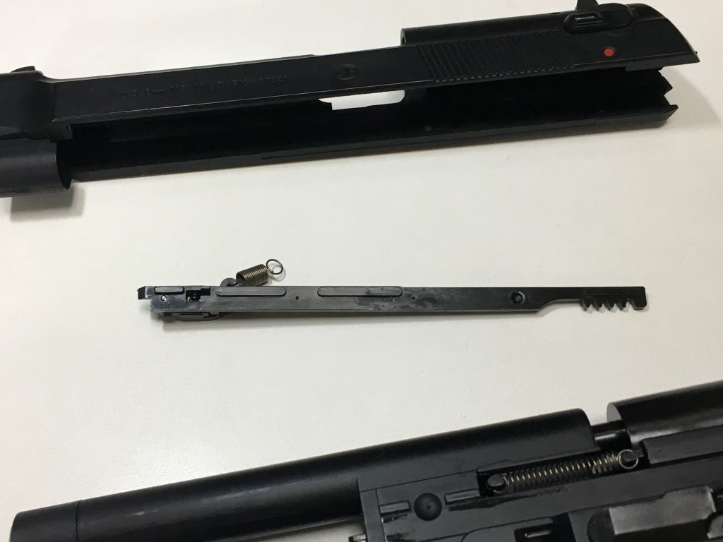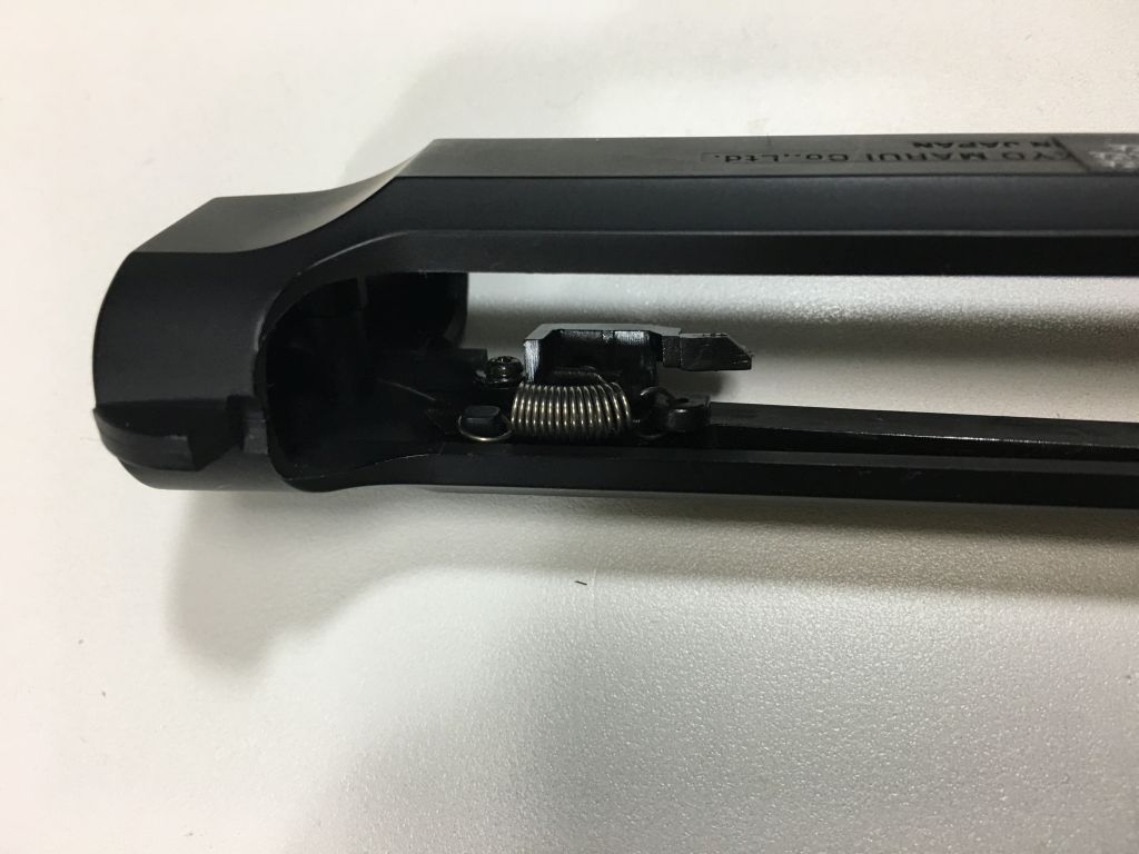 M9A1詳細 投稿日時: 2017/07/03 投稿者: fuyuki この棒がスライドを動かしています。 拡大図 取り外したところ ひっかかり具合 上から見た図 下から見た図 このポッチにバネがかかっています。